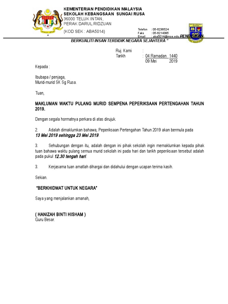 Surat Makluman Waktu Pulang Murid Pdf