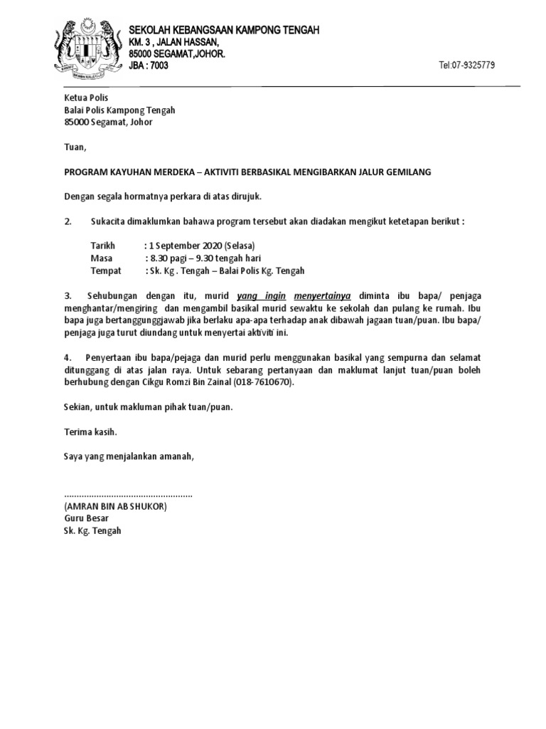 BapakIbu Wali Peserta Didik TK. Ini merupakan format atau contoh surat rasmi kebenaran khas yang dikeluarkan oleh pihak sekolah bagi membenarkan murid merentas negeri atau daerah untuk pulang ke asrama sewaktu Perintah Kawalan Pergerakan PKP. Surat tidak hadir ke sekolah atau cuti sakitramai ibu bapa dan pelajar yang banyak membuat carian tentang contoh surat rasmi tidak hadir ke sekolah.